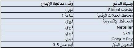 فيما يلي أوقات المعالجة النموذجية للإيداع حسب وسيلة الدفع: