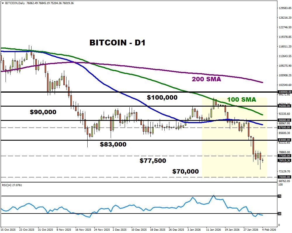 Regarding Bitcoin, it continues to linger below the $77,500 level amid the general caution. Sustained weakness under this point may open a path toward $70,000. A move back above $80,000 could open a path toward the 50-day SMA at $88,200.