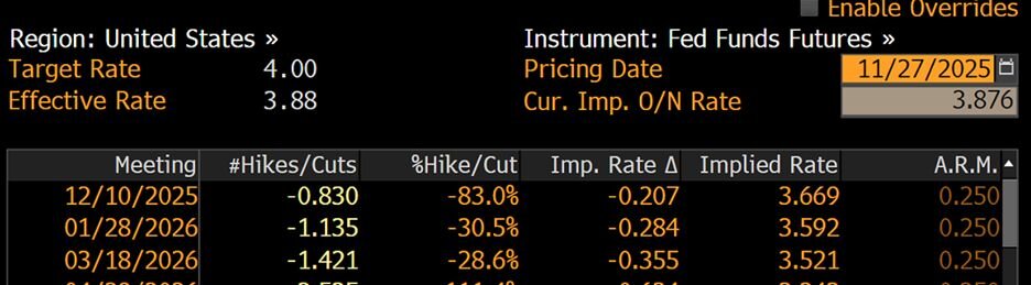 Traders are currently pricing an 83% chance that the Fed cuts rates in December.