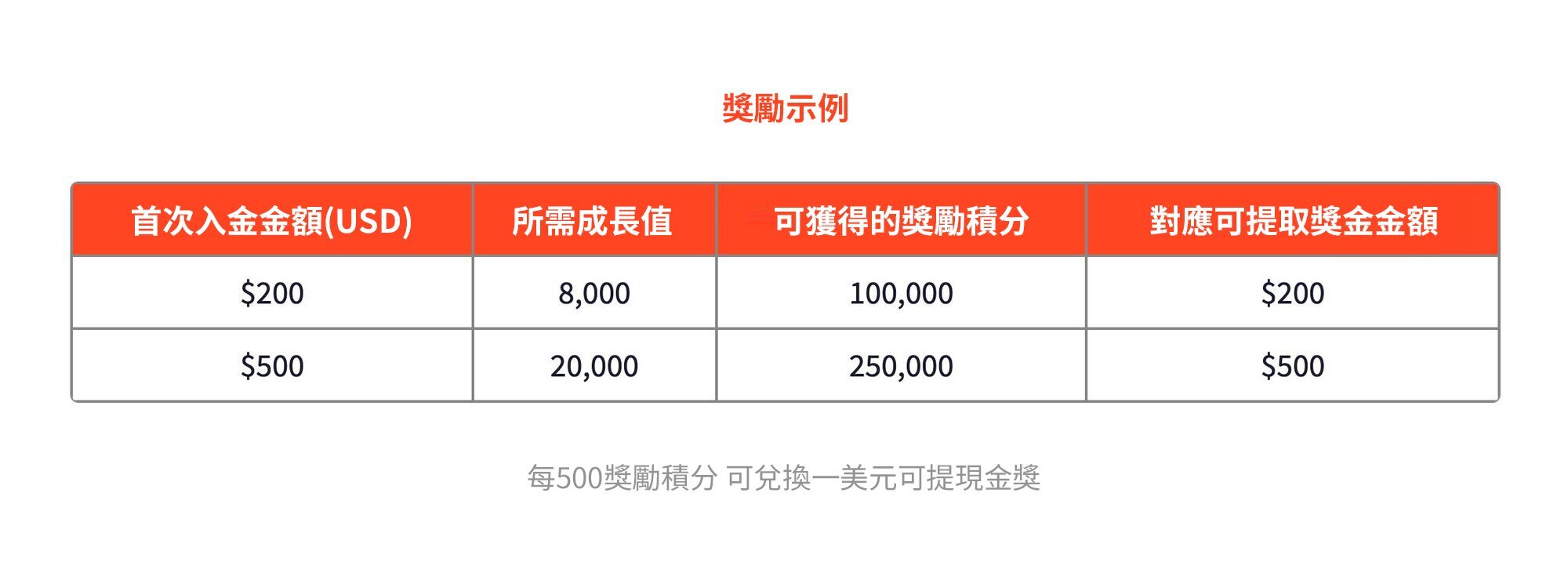 每2,000成長值,即可解鎖 25,000獎勵積分;達成250,000獎勵積分即可兌換$500並提現
